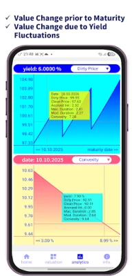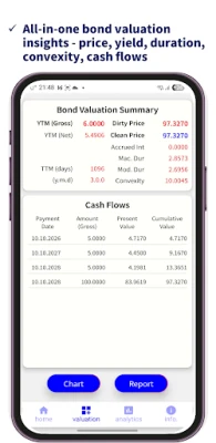 Depășind capacitățile foilor de calcul standard, această soluție mobilă oferă analize de nivel profesional, transformând complexitatea în claritate. Utilizatorii au libertatea de a genera și exporta rapoarte sumare detaliate de evaluare a obligațiunilor, consolidând astfel înțelegerea și documentarea deciziilor. Destinată investitorilor în instrumente cu venit fix, traderilor de obligațiuni, bancherilor privați, managerilor de averi, profesioniștilor din managementul activelor, precum și academicienilor și studenților din domeniile finanțelor și cantitative, aplicația este un aliat indispensabil pentru oricine dorește să aprofundeze analiza pieței de capital.