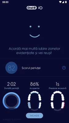 După fiecare periaj ghidat, veți primi un rezumat detaliat al performanței, inclusiv un scor, pentru o înțelegere imediată a progresului. Aplicația Oral-B vă oferă sfaturi personalizate, adaptate stilului dumneavoastră unic de periaj, indicându-vă exact unde puteți aduce îmbunătățiri. Accesați hărți de dentiție care arată zonele de presiune excesivă și urmăriți tendințele istorice ale periajului – săptămânal, lunar și anual. Această abordare bazată pe date s-a dovedit transformatoare: utilizatorii periuțelor Oral-B conectate la aplicație își periază dinții mai mult de două minute în peste 90% din cazuri, cu o presiune optimă și o îmbunătățire vizibilă a sănătății orale pentru peste 82% dintre ei.