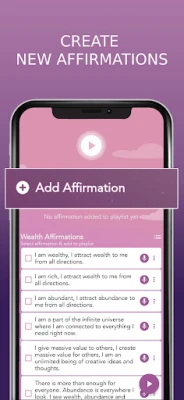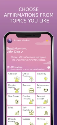 Personalizarea este cheia succesului tău cu Success Mindset. Ai libertatea de a înregistra afirmații cu propria voce, adăugând o notă autentică mesajelor de încurajare. Creează-ți liste de redare personalizate, stabilește memento-uri matinale și serale pentru a integra gândirea pozitivă în rutina ta zilnică. Adaugă muzică de fundal relaxantă sau teme vizuale care te inspiră, bucurându-te de redare continuă în fundal. De la afirmații pentru bogăție și succes, la cele pentru creativitate, gândire critică și afaceri, inclusiv cele zece suluri din "Cel Mai Mare Vânzător din Lume" de O.G. Mandino, Success Mindset acoperă o gamă variată de categorii pentru o dezvoltare completă. Poți chiar să-ți setezi afirmațiile preferate ca ton de alarmă și să-ți păstrezi în siguranță toate înregistrările și personalizările.